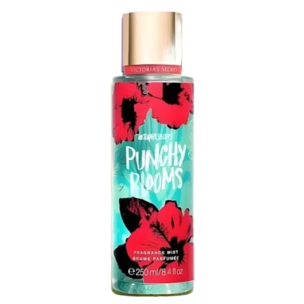 El Body Splash "Punchy Blooms" de Victoria’s Secret es una fragancia floral frutal que combina notas de flor de hibisco, cáscara de mango y un toque de brillo cítrico, creando una fragancia fresca, tropical y energética